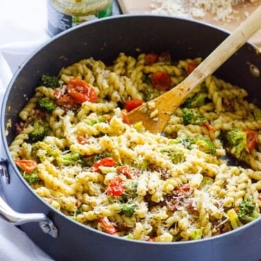 Healthy Pesto Pasta recipe is simple to prepare in just over 30 minutes and is bursting with flavor from pesto, sun-dried tomatoes, broccoli and Parmesan cheese.