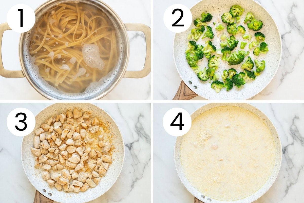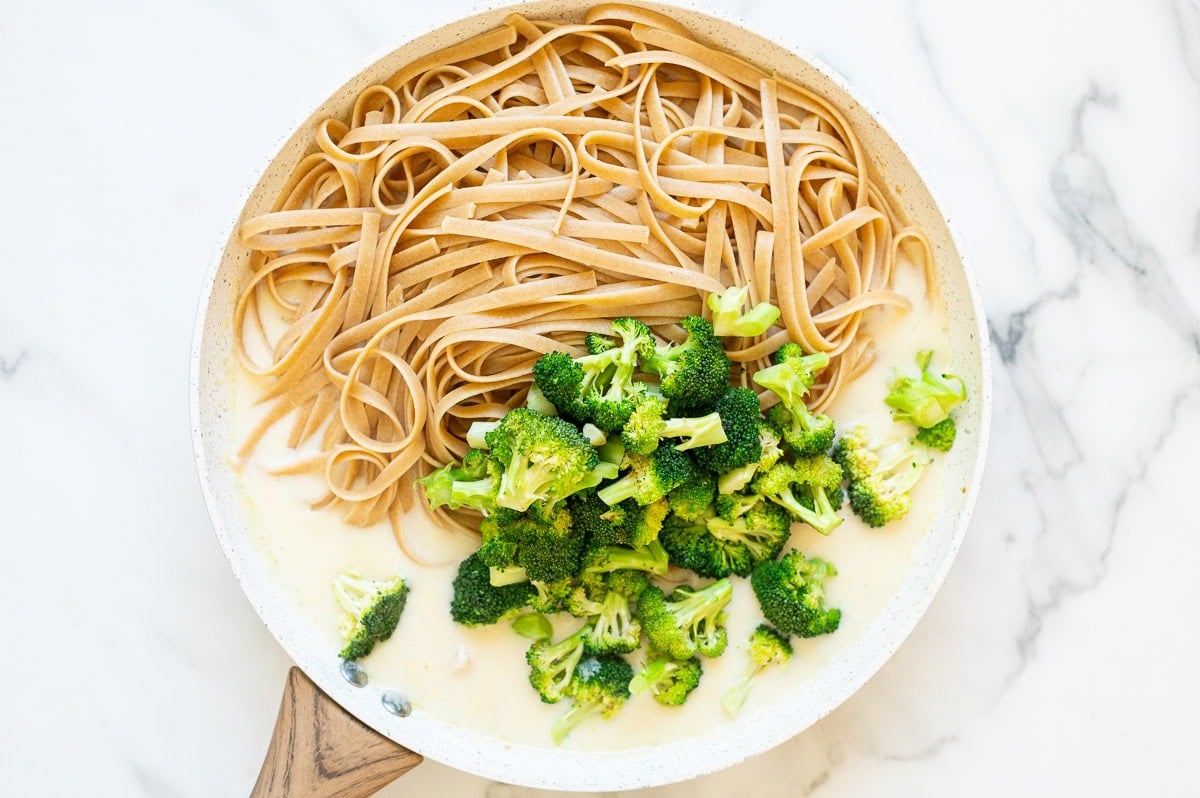 - Combine everything: Add previously cooked broccoli and pasta to the skillet with sauce, stir and allow the chicken fettuccine alfredo to fully warm through for a minute.