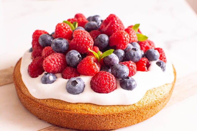 Almond Cake made flourless with almond meal, refined sugar free with honey, and dairy free with whipped coconut cream. Light and tasty almond flour cake recipe with fresh fruit.