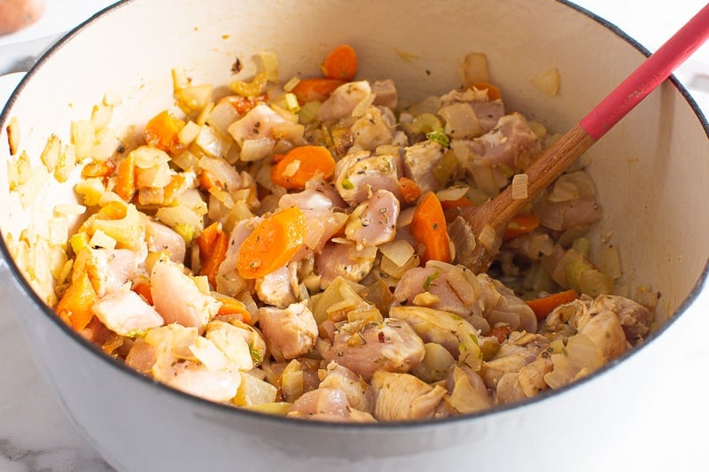 - Add chicken: Next, add the chicken, dried herbs, and spices with exception of the bay leaves. Continue to sautรฉ just until browned a bit, stirring once.